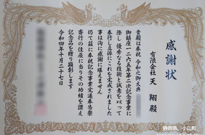 某神社より感謝状をいただきました